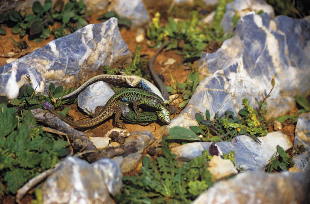 The main aim during the two herpetological expeditions to the Northern Sporades Archipelago was a complete assessment of the distribution pattern and variation range of the lizard species Podarcis (=Lacerta) erhardii subspec., on the 48 islands which provided suitable habitats. As a rule, all islands that sustained the shrub Pistacia lentiscus were inhabited by the lizards. We found small populations only on a very few isles without the shelter of the evergreen Pistacia, e.g. on Strongylò off Skantzoura (cf. the article Strongylò – the living dead). Of particular interest was the territorial behaviour of male lizards on these very confined patches of inhabited land. Again the bushes of Pistacia designated the size and distribution of these territories. Cannibalism was observed at several occasions; it is seen as another behavioural adaptive consequence of the very confined living conditions on small islands.